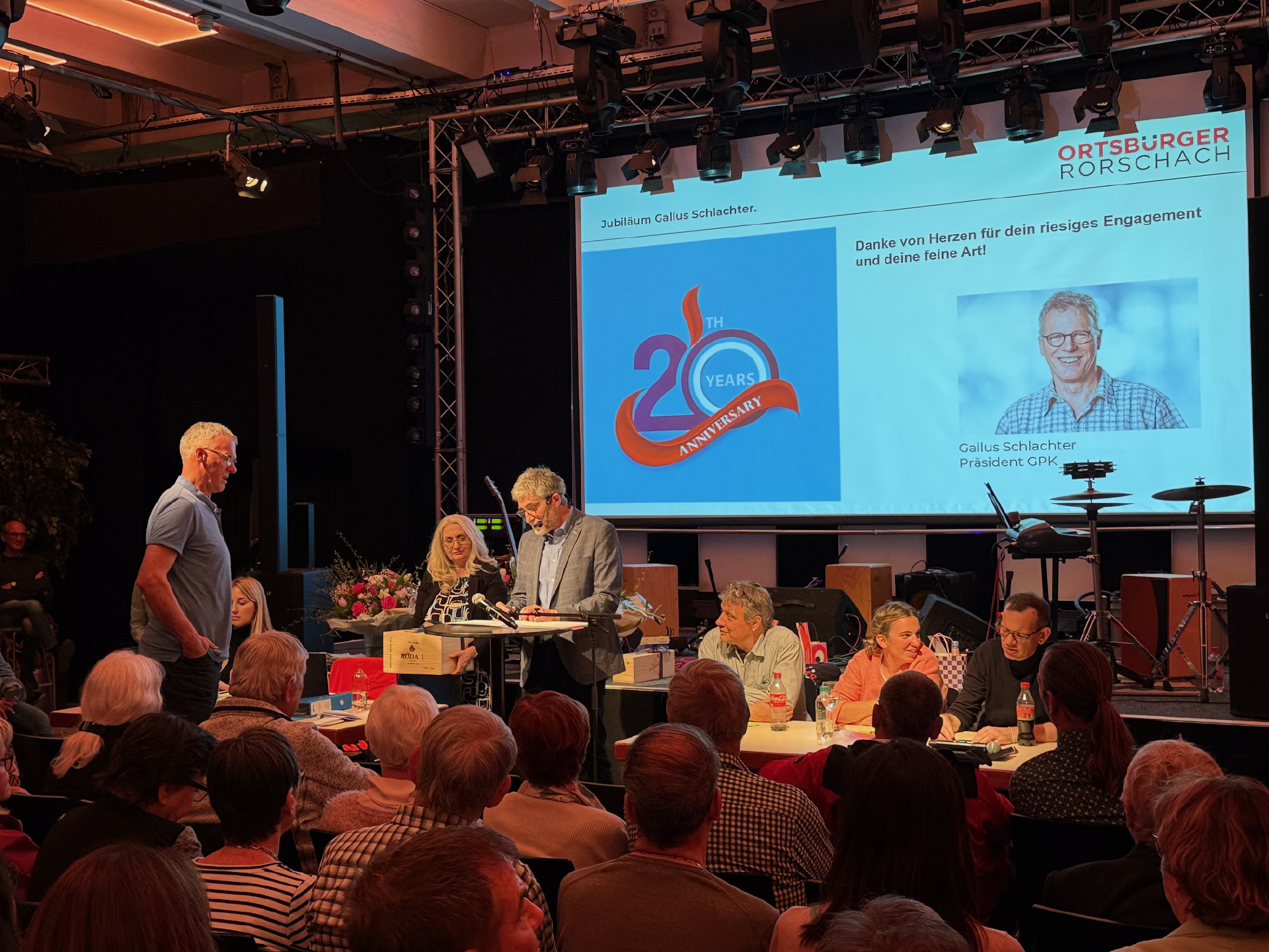Gallus Schlachter, Präsident der Geschäftsprüfungskommission, wurde für sein 20jähriges Engagement für die Ortsbürgergemeinde mit grossem Applaus bedacht. Robert Raths, Stadtpräsident Rorschach, überbrachte die Grüsse des Stadtrats und musikalisch umrahmt wurde der Abend von der Band «Waterback» aus Rorschach.